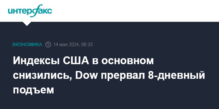 Индексы США в основном снизились, Dow прервал 8-дневный подъем