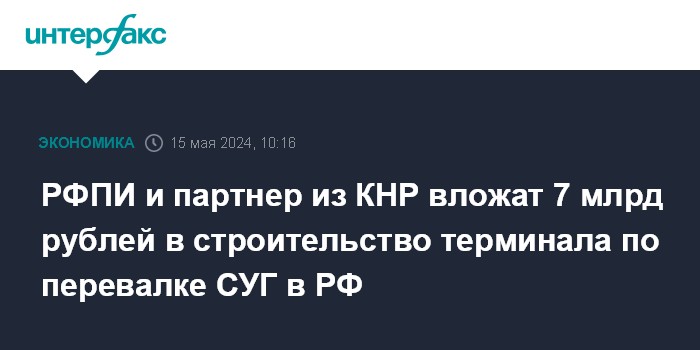 Москва. 15 мая. INTERFAX.RU - Российский фонд прямых инвестиций вместе с китайским партнером вложат около 7 млрд рублей в строительство морского терминала по перевалке сжиженных углеводородных газов (СУГ) на Дальнем Востоке, сообщил журналистам глава РФПИ Кирилл Дмитриев.