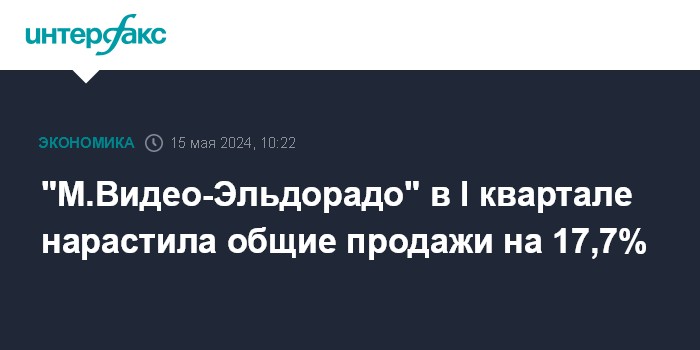 Москва. 15 мая. INTERFAX.RU - ПАО "М.Видео" (группа "М.Видео-Эльдорадо") в I квартале 2024 года увеличило общие продажи (GMV) на 17,7% -до 131,3 млрд рублей, говорится в сообщении группы.