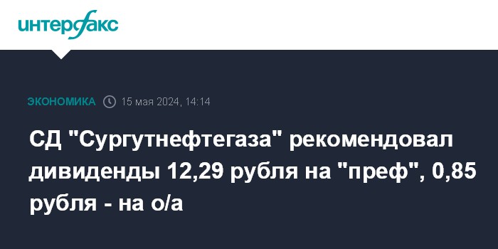 Москва. 15 мая. INTERFAX.RU - Совет директоров "Сургутнефтегаза" рекомендовал дивиденды за 2023 год в размере 12,29 рубля на привилегированную акцию, 0,85 рубля на обыкновенную акцию, сообщила компания.
