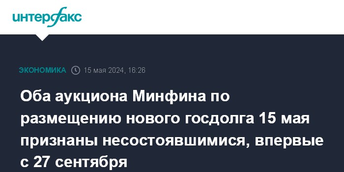 Оба аукциона Минфина по размещению нового госдолга 15 мая признаны несостоявшимися, впервые с 27 сентября
