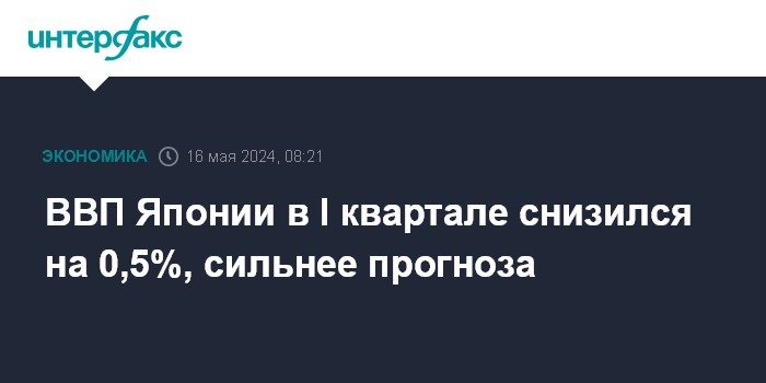 Москва. 16 мая. INTERFAX.RU - Экономика Японии в первом квартале сократилась на на 0,5% к четвертому кварталу 2023 года, по предварительным данным правительства страны.