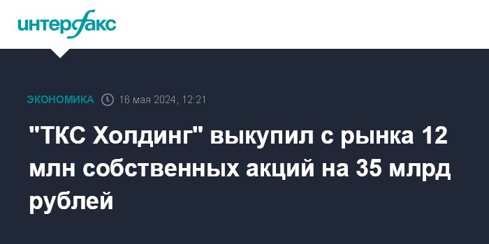 Москва. 16 мая. INTERFAX.RU - МКПАО "ТКС Холдинг" в рамках ранее утвержденной программы с начала 2024 года и по состоянию на конец апреля выкупило 12 млн собственных акций (6% капитала) на общую сумму 35 млрд рублей, сообщила группа.