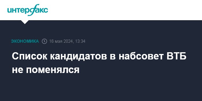 Москва. 16 мая. INTERFAX.RU - Список кандидатов в наблюдательный совет ВТБ для утверждения на годовом собрании акционеров остался таким же, как и в 2023 году, следует из бюллетеня для голосования, с которым ознакомился "Интерфакс".