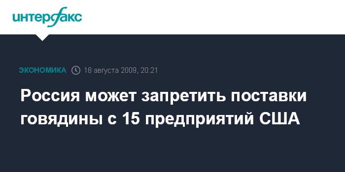 Москва. 18 августа. INTERFAX.RU - Россия может запретить поставки говядины с 15 предприятий США. Как сообщил "Интерфаксу" руководитель Россельхознадзора Сергей Данкверт, служба предупредила американских коллег о том, что если не будут предоставлены материалы о выполнении поставщиками российских требований, то 15 предприятиям, экспортирующим говядину в Россию, будет ограничен доступ на российский рынок.