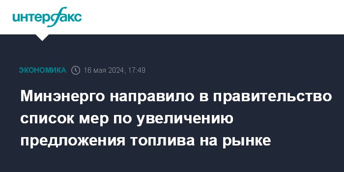 Москва. 16 мая. INTERFAX.RU - Минэнерго РФ направило свои предложения в ответ на поручение, данное в начале мая главой правительства РФ Михаилом Мишустиным в рамках работы над формированием экономики предложения, сообщили "Интерфаксу" в министерстве.