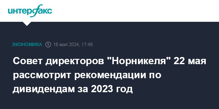 Москва. 16 мая. INTERFAX.RU - Совет директоров "Норильского никеля" 22 мая рассмотрит рекомендации по размеру дивидендов по результатам 2023 года, говорится в сообщении компании.