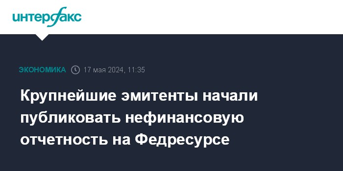 Москва. 17 мая. INTERFAX.RU - Крупнейшие российские эмитенты начали публиковать ESG-показатели на Федресурсе в соответствии с новыми рекомендациями Минэкономразвития, первыми ключевые показатели нефинансовой отчетности за 2023 год раскрыли ООО "Корпоративный центр Икс 5", управляющее активами ритейлера X5 Group, и энерго-металлургический холдинг МКПАО "Эн+ груп".
