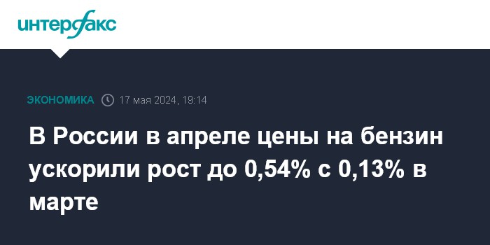 Москва. 17 мая. INTERFAX.RU - В России в апреле потребительские цены на бензин выросли по сравнению с мартом на 0,54% после роста на 0,13% в марте к февралю и стабильности в феврале (рост на символические 0,01%), сообщил Росстат.