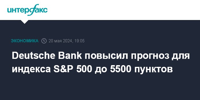 Москва. 20 мая. INTERFAX.RU - Аналитики Deutsche Bank повысили прогноз значения американского фондового индекса S&P 500 до 5500 пунктов с ранее ожидавшихся 5100 пунктов.
