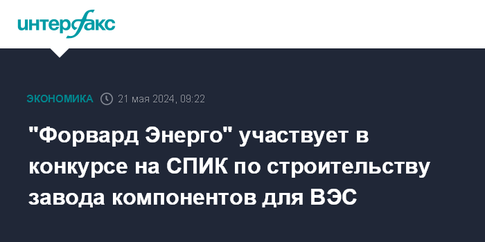 Москва. 21 мая. INTERFAX.RU - ПАО "Форвард Энерго" (бывшее ПАО "Фортум" финской компании Fortum, находится под управлением Росимущества) стало единственным участником конкурса на заключение специального инвестконтракта (СПИК 2.0) на строительство завода по производству компонентов для ветроэлектростанций (ВЭС) в России, пишет "Коммерсантъ" со ссылкой на источники.