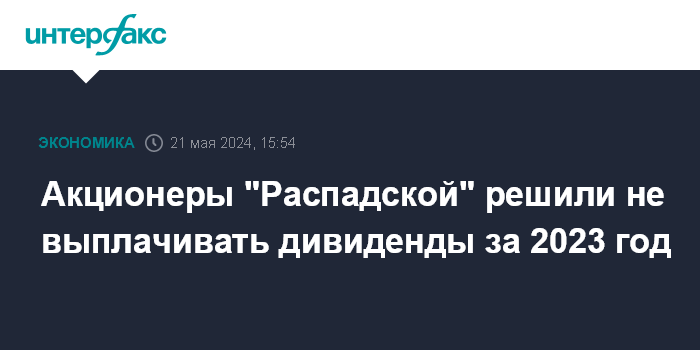 Москва. 21 мая. INTERFAX.RU - Акционеры ПАО "Распадская" на годовом собрании 21 мая приняли решение не выплачивать дивиденды по результатам 2023 года, сообщила компания.
