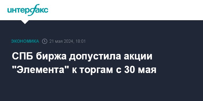 СПБ биржа допустила акции "Элемента" к торгам с 30 мая