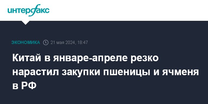 Москва. 21 мая. INTERFAX.RU - Китай в январе-апреле этого года по сравнению с аналогичным периодом 2023 года существенно увеличил закупки зерна в РФ.