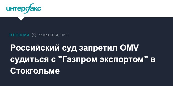 Москва. 22 мая. INTERFAX.RU - Арбитражный суд Санкт-Петербурга и Ленинградской области удовлетворил заявление ООО "Газпром экспорт" о запрете OMV Gas Marketing and Trading GmbH продолжать арбитражное разбирательство в Арбитражном институте Торговой палаты города Стокгольма.