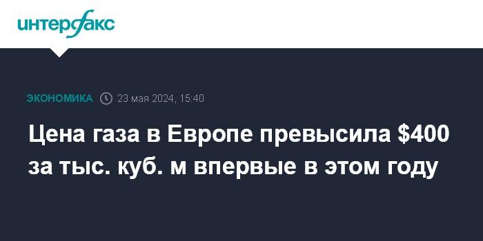 Москва. 23 мая. INTERFAX.RU - Спотовая цена газа в Европе впервые в этом году превысила $400 за тысячу кубов.