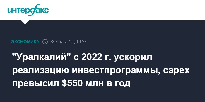 "Уралкалий" с 2022 г. ускорил реализацию инвестпрограммы, capex превысил $550 млн в год