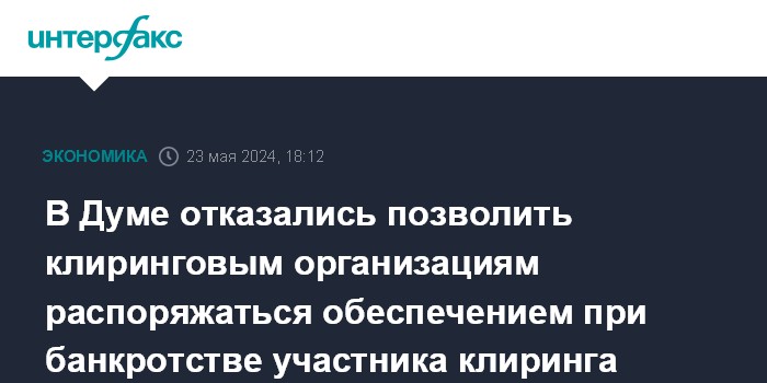 Москва. 23 мая. INTERFAX.RU - Комитет Госдумы по финансовому рынку не поддержал идею о предоставлении клиринговым организациям права оставлять обеспечение себе при банкротстве участника клиринга. Соответствующие нормы были исключены из законопроекта о правилах прекращения обязательств на случай несостоятельности участника клиринга.