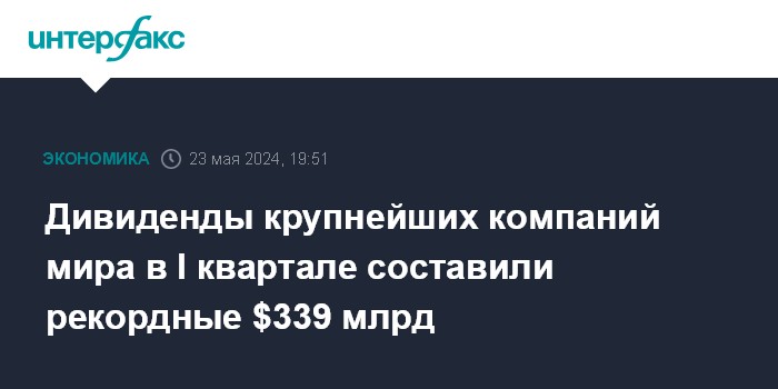 Москва. 23 мая. INTERFAX.RU - Совокупный объем дивидендов, выплаченных крупнейшими компаниями мира, в первом квартале составил рекордные $339,2 млрд, что на 2,4% превысило показатель за аналогичный период прошлого года, говорится в исследовании британской Janus Henderson Investors.