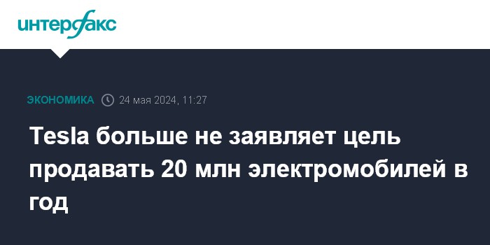 Москва. 24 мая. INTERFAX.RU - Американская Tesla удалила из своего ежегодного отчета о воздействии на окружающую среду, использовании водных ресурсов и кадровой политике (Impact Report) упоминание о цели продавать к концу десятилетия по 20 млн машин в год.