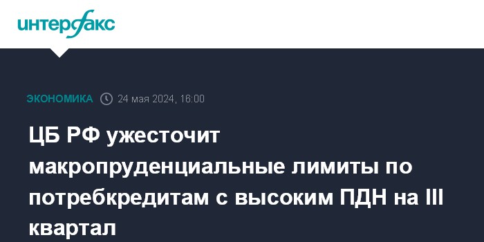 Москва. 24 мая. INTERFAX.RU - Банк России ужесточает макропруденциальные лимиты по кредитам с высоким показателем долговой нагрузки (ПДН) на III квартал 2024 года, сообщил регулятор.