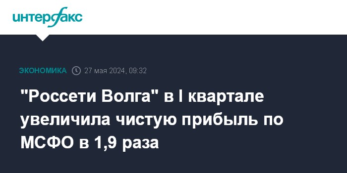 Москва. 27 мая. INTERFAX.RU - ПАО "Россети Волга" в январе-марте 2024 года получило чистую прибыль в размере 1,585 млрд рублей, что в 1,9 раза больше, чем в первом квартале 2023 года, говорится в отчетности компании по МСФО.