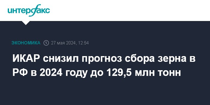 ИКАР снизил прогноз сбора зерна в РФ в 2024 году до 129,5 млн тонн