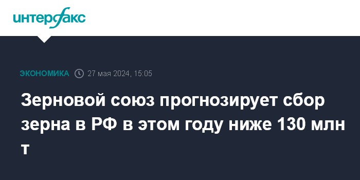 Зерновой союз прогнозирует сбор зерна в РФ в этом году ниже 130 млн т