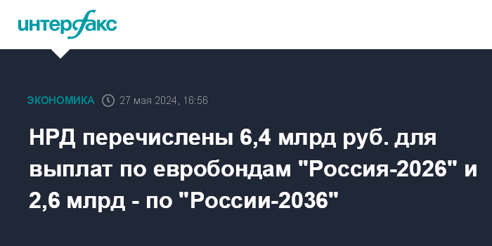 НРД перечислены 6,4 млрд руб. для выплат по евробондам "Россия-2026" и 2,6 млрд - по "России-2036"