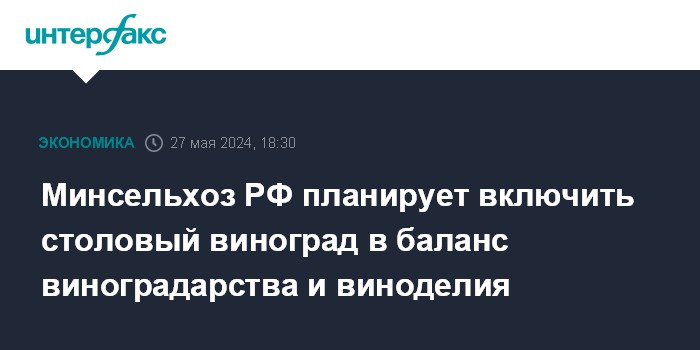 Москва. 27 мая. INTERFAX.RU - Минсельхоз РФ планирует включить столовые сорта винограда, которые употребляются в свежем виде, в баланс виноградарства и виноделия.