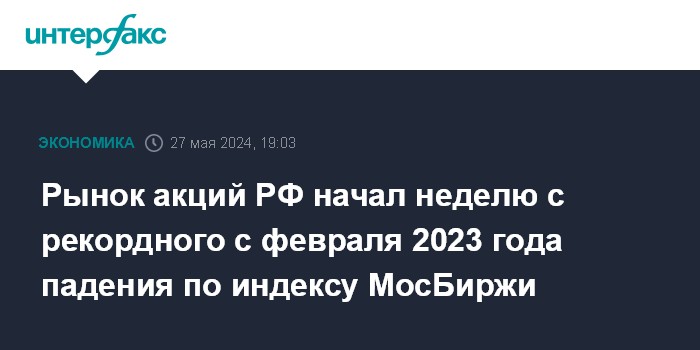 Рынок акций РФ начал неделю с рекордного с февраля 2023 года падения по индексу МосБиржи