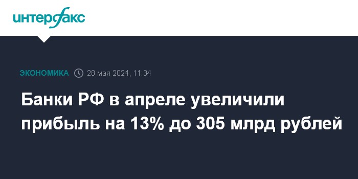 Москва. 28 мая. INTERFAX.RU - Российские банки в апреле 2024 года увеличили чистую прибыль до 305 млрд рублей, что на 13% выше уровня прибыли за март (270 млрд рублей), говорится в обзоре ЦБ РФ о развитии банковского сектора.