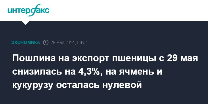Пошлина на экспорт пшеницы с 29 мая снизилась на 4,3%, на ячмень и кукурузу осталась нулевой