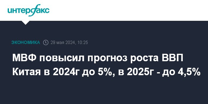 Москва. 29 мая. INTERFAX.RU - Международный валютный фонд (МВФ) повысил прогноз роста экономики Китая в 2024 году до 5%, в 2025 году - до 4,5%, говорится в пресс-релизе организации.