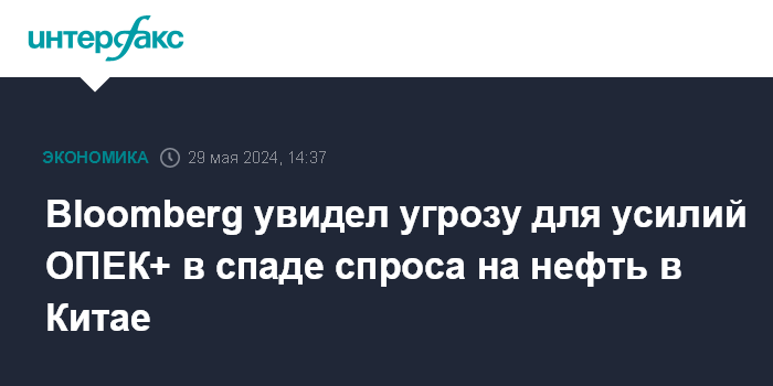 Москва. 29 мая. INTERFAX.RU - ОПЕК+ ограничивает поставки нефти на мировой рынок, чтобы избежать избытка предложения и поддержать цены, однако снижение спроса на сырье в Китае может поставить под угрозу усилия альянса, предупреждает Bloomberg.