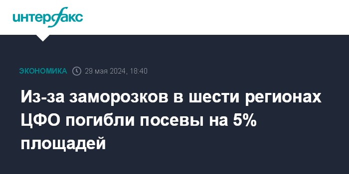 Москва. 29 мая. INTERFAX.RU - Посевы сельхозкультур в шести областях Центрального федерального округа, где из-за заморозков введен режим ЧС, погибли на 5% площадей, говорится в ежемесячном докладе Банка России "Региональная экономика"