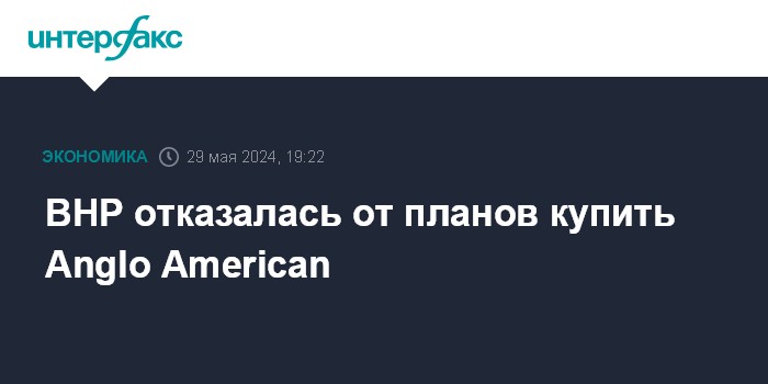 Москва. 29 мая. INTERFAX.RU - Австралийская горнодобывающая группа BHP объявила, что не станет направлять окончательное предложение о приобретении конкурента Anglo American до истечения срока в среду.
