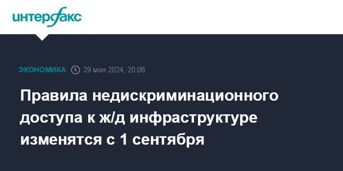 Москва. 29 мая. INTERFAX.RU - Правительство утвердило обновленную редакцию "правил недискриминационного доступа перевозчиков к инфраструктуре железнодорожного транспорта общего пользования, грузоотправителей к услуге по перевозке грузов железнодорожным транспортом" (ПНД), они вступят в силу с 1 сентября 2024 года.