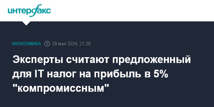 Москва. 29 мая. INTERFAX.RU - Введение в России налога на прибыль в размере 5% для IT-компаний не должно привести к существенным негативным последствиям, а также ослаблению инвестиционной активности на рынке, считают большинство опрошенных "Интерфаксом" экспертов из отраслевых ассоциаций, профильных аналитиков инвестбанков, участников рынка.