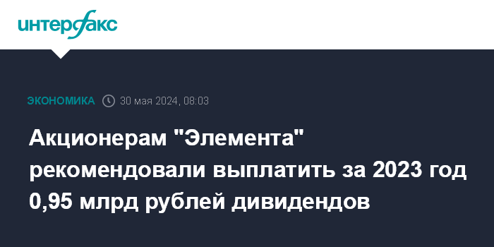 Акционерам "Элемента" рекомендовали выплатить за 2023 год 0,95 млрд рублей дивидендов