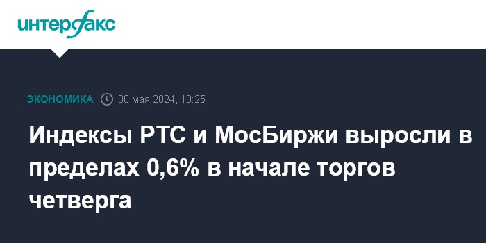 Индексы РТС и МосБиржи выросли в пределах 0,6% в начале торгов четверга