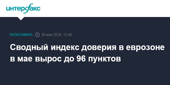 Москва. 30 мая. INTERFAX.RU - В мае 2024 года сводный индекс делового и потребительского доверия в еврозоне увеличился до 96 пунктов с 95,6 пункта месяцем ранее, говорится в отчете Еврокомиссии.
