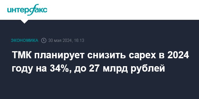 Москва. 30 мая. INTERFAX.RU - "Трубная металлургическая компания" в 2024 году может сократить капитальные затраты на 34% по сравнению с предыдущим годом.