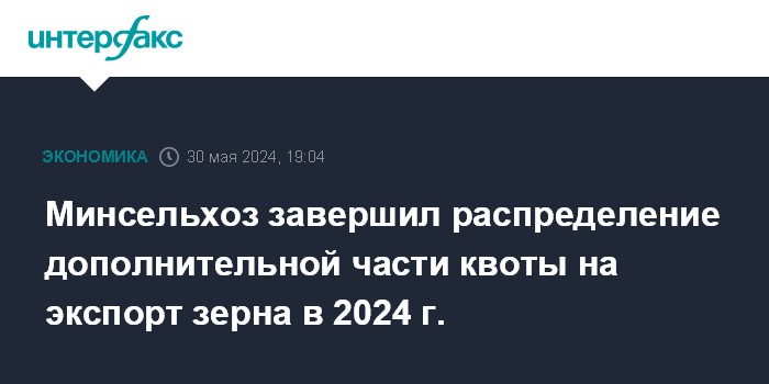 Москва. 30 мая. INTERFAX.RU - Минсельхоз РФ завершил распределение дополнительной части квоты на экспорт зерна в 2024 году.