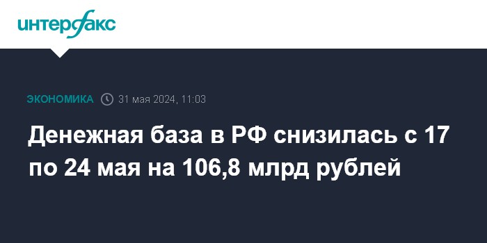 Денежная база в РФ снизилась с 17 по 24 мая на 106,8 млрд рублей