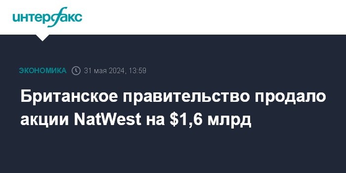 Москва. 31 мая. INTERFAX.RU - Правительство Великобритании продало 392,4 млн акций банка NatWest Group за 1,24 млрд фунтов стерлингов ($1,58 млрд), пишет MarketWatch со ссылкой на официальный пресс-релиз.