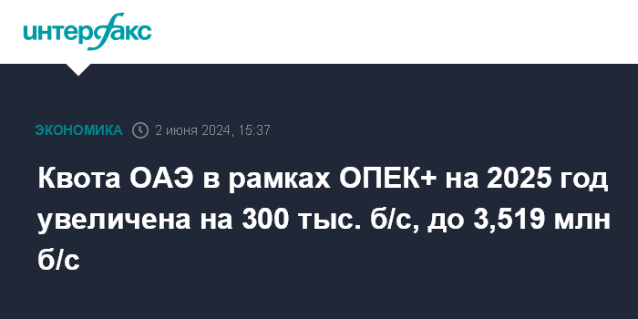 Квота ОАЭ в рамках ОПЕК+ на 2025 год увеличена на 300 тыс. б/с, до 3,519 млн б/с