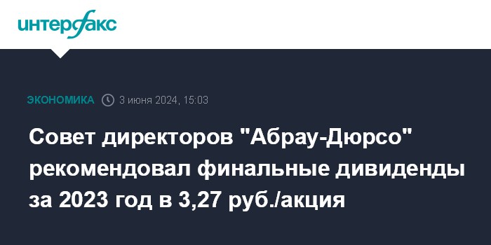 Москва. 3 июня. INTERFAX.RU - Совет директоров ПАО "Абрау-Дюрсо", ведущего производителя игристых вин в РФ, рекомендовал финальные дивиденды за 2023 год в размере 3,27 рубля на акцию, сообщается в материалах компании.