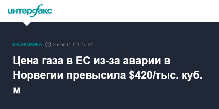 Москва. 3 июня. INTERFAX.RU - Спотовая цена газа в Европе впервые за последние полгода превысила $420 за тысячу кубов.