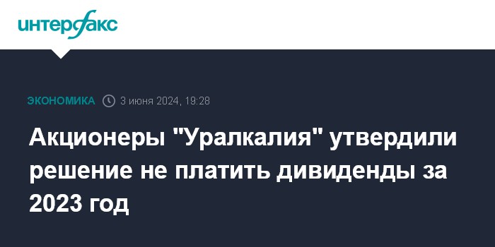 Москва. 3 июня. INTERFAX.RU - Акционеры "Уралкалия" на годовом собрании утвердили решение не выплачивать дивиденды на все виды акций по итогам 2023 года, сообщила компания.